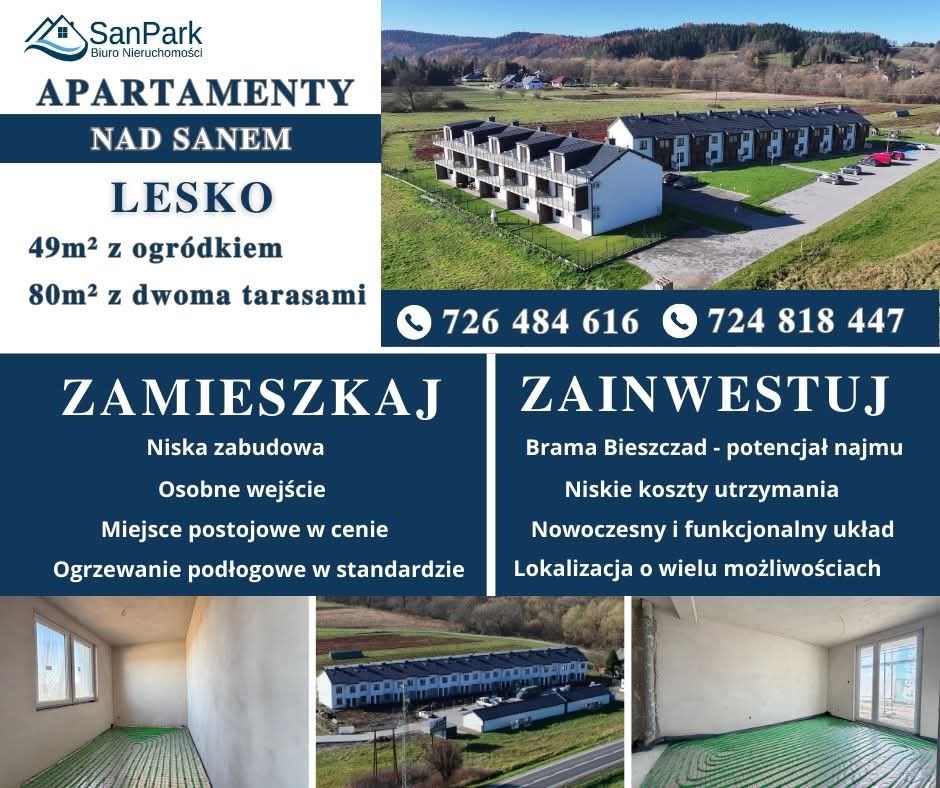 Osiedle Apartamenty nad Sanem to zespół 12 budynków w zabudowie szeregowej, oferujących łącznie 24 lokale. Wśród nich znajduje się 12 mieszkań z przynależnymi ogródkami oraz 12 mieszkań z poddaszami i przestronnymi tarasami na dachu.